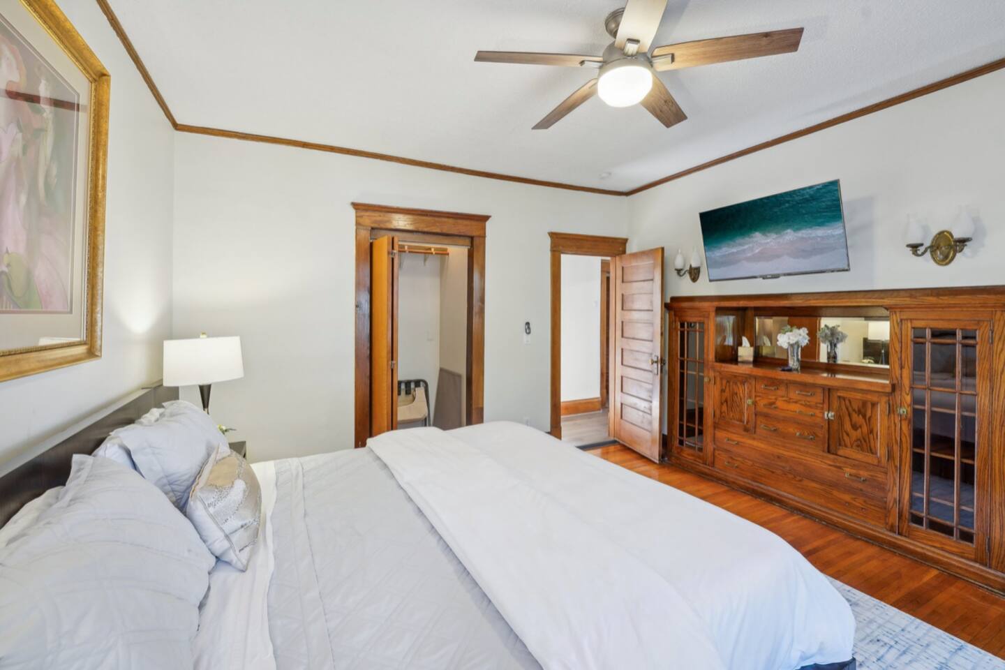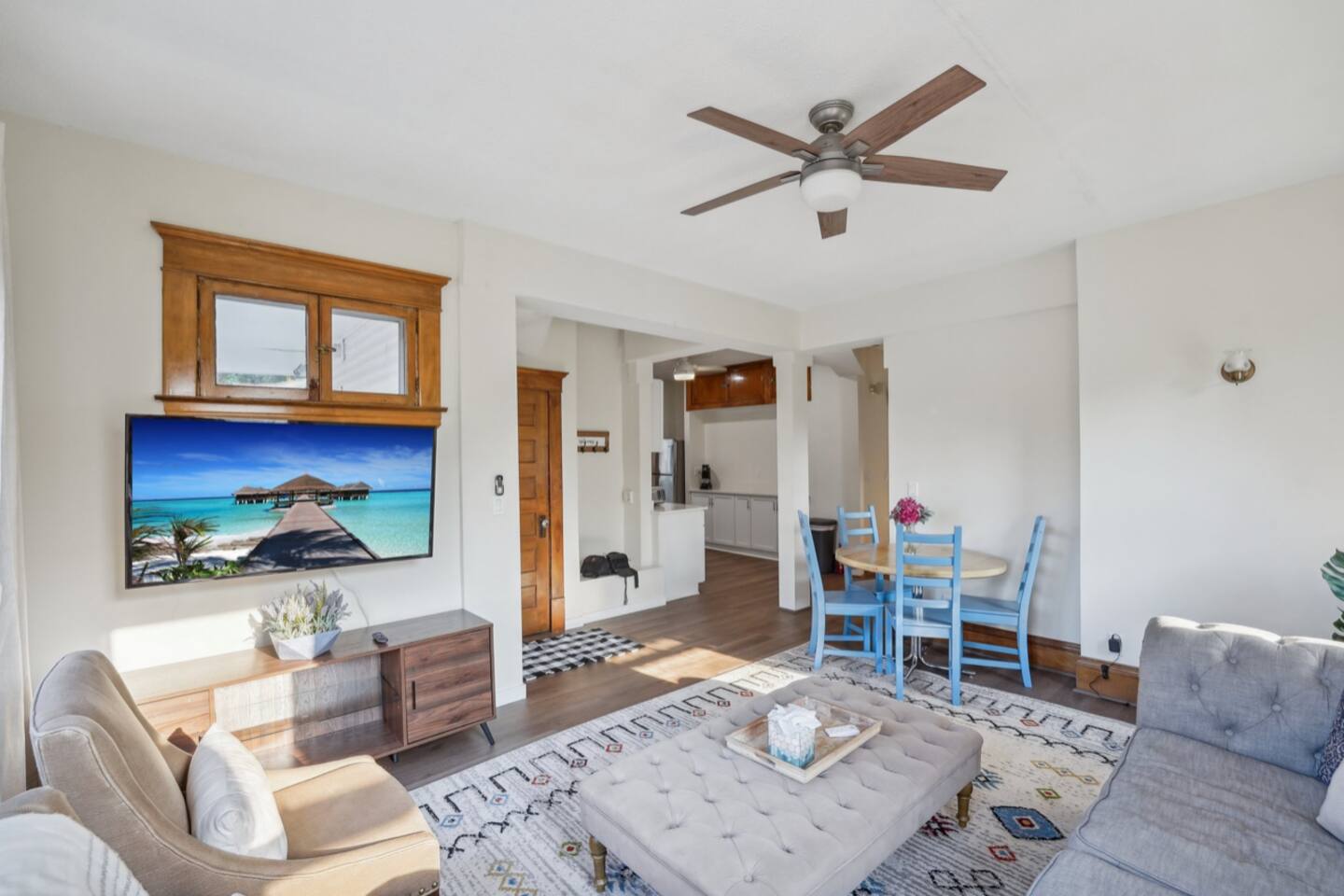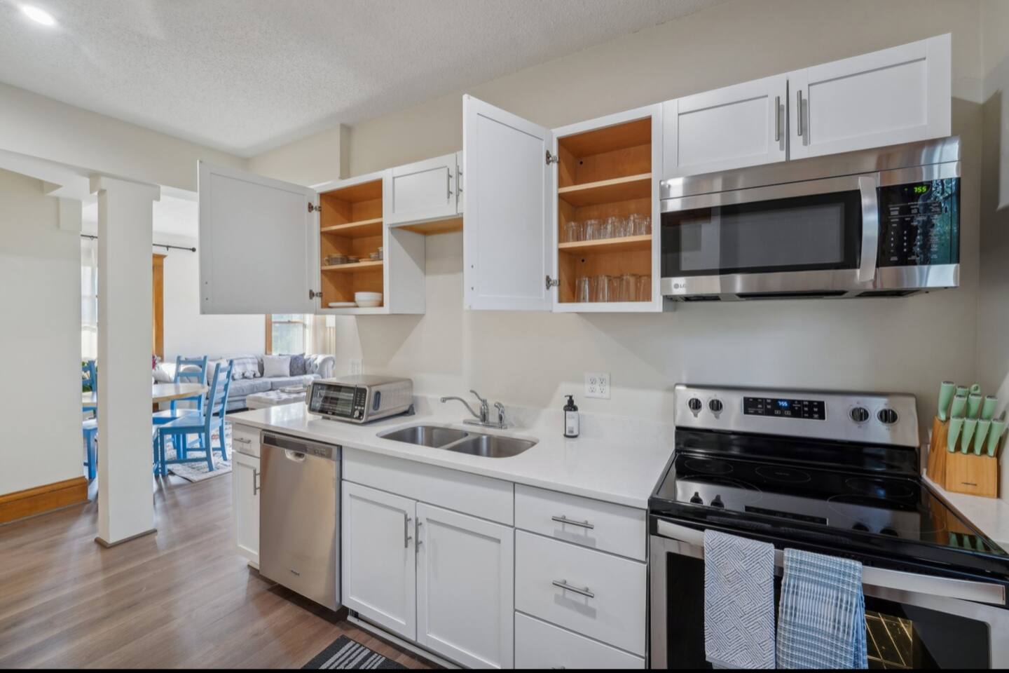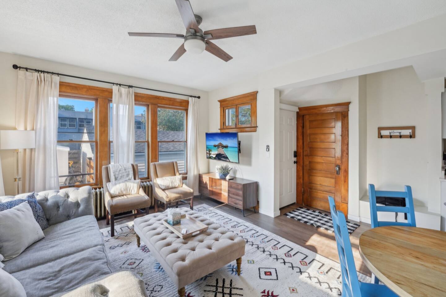 With its own separate entrance, step into charming comfort immediately with open living room + dining room. The apartment provides great privacy for each guest: BEDROOMS • Main floor: Bedroom 1: King Bed | Bedroom 2: Twin Bunk Beds + 1 full bathroom • Lower level Bedroom 3: Queen Bed KITCHEN: Stainless steel appliances, cooking basics, dishware/flatware, dishwasher, stove/oven, refrigerator, toaster oven, keurig pods, and dishwasher pods BATHROOM: 6 towels + colored washcloths for make-up removal. Shampoo + Conditioner, hair dryer, iron with clothes steamer (all-in one) GENERAL: Each bedroom & living room has its own smart TV with roku guest privacy where only you have access to your accounts + a suitcase holder with a laundry basket below. Free WiFi, shared coin operated washer/dryer (in basement), great antique radiators original from 1905 and window air conditioning for our beautiful summers, clothes hangers, trash bags/paper towels included. If you're ready for fresh air, or to enjoy the great MN season, enjoy the lovely fenced in yard and patio, too! Shared coin operated laundry space is provided in the basement with easy access from the lower level bedroom. Under the kitchen sink you will find complimentary laundry detergent pods and fabric softener sheets. FAQ: • Stairs required to access: 3 stairs from the sidewalk, and 3 stairs into the house, 1 bedroom is in the lower level. • 1 exterior security camera (outward facing), pet fee (paid pre-trip, 1 pet max). • This apartment will fit 4 adults and 2 children very comfortably. The twin bunk beds in the smallest room have a max weight of 150lbs per bed. PARKING: free street parking, it’s a corner property providing plenty of space. Guest access Guests will have access to the entire property via keyless entry Other things to note - No smoking - Pet friendly w/ $75 fee (+ fees and taxes, 1 pet max) - No events, parties, or large gatherings - Must be at least 25 years old to book - Additional fees and taxes may apply - Photo ID may be required upon check-in - NOTE: The property requires stairs to access - NOTE: Your safety matters. The property has cameras in the exterior of the building, none inside. The camera is outward facing and does not look into interior spaces. The camera records video and sound when activated by motion CHECK-IN TIMES: Please arrange your arrival time in advance with the host. Typically scheduled for 4pm. CHECK-OUT TIMES: Check-out time is at 11:00 am.